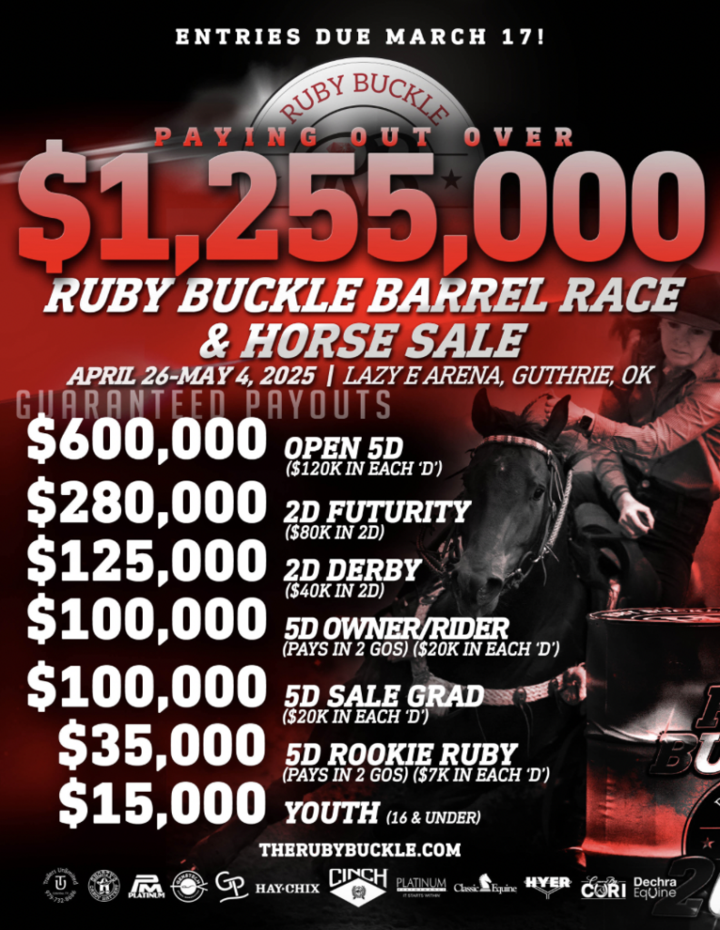 Entries close on March 17 for the first leg of Ruby Buckle barrel racing events, featuring a guaranteed payout of $1,255,000 in Guthrie, Oklahoma, on April 26-May 4.