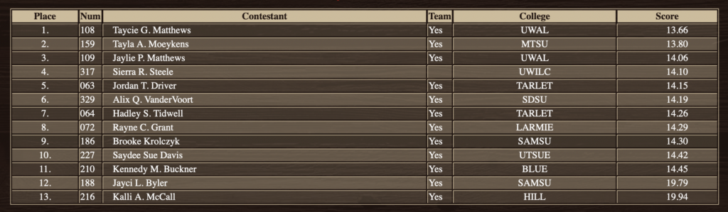At the end of the week, it was Taycie Matthews and Fame Fire Rocks who clinched the national championship for herself, and helped her women’s team at The University of West Alabama earn their second consecutive National Championship. Taycie’s sister and felow teammate Jaylie also finished solid in the national standings after coming in third in the final round.