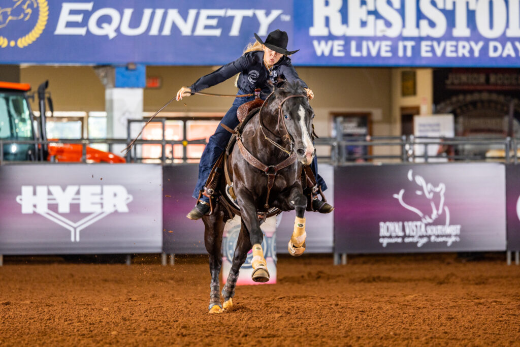 Taylor Miniat kicked off the week with the 1D win aboard Kissa Goodbye, stopping the clock in 16.691. The 2020 mare is by The Goodbye Lane and out of Ms Baby Girl by Mark My Dial. The go-round paid $20,600 to owners Brad & Karly Knight, plus $2,575 each to the stallion and to the Knights as breeders.
