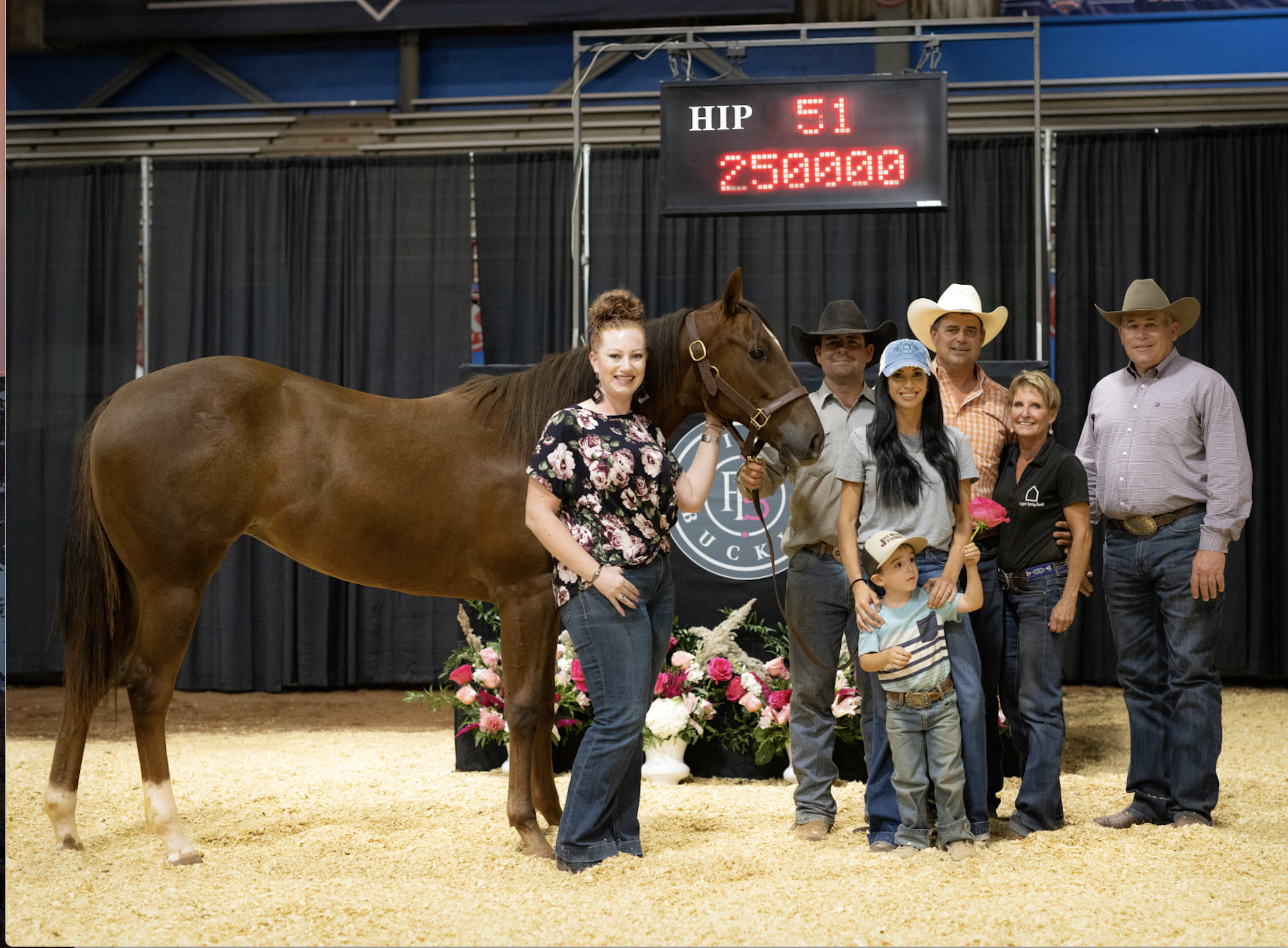When the gavel dropped on the sale stage, Treis My Fame had topped the sale at $250,000. “I feel a lot of excitement about breeding her to our stallions, which are all in Pink Buckle. I believe she’s going to be very special,” she said.